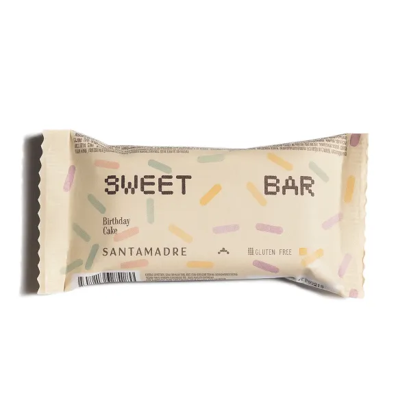 De energiereep Santa Madre Verjaardagstaart levert bijna 40 g koolhydraten in een zachte textuur op basis van glutenvrije haver met een feestelijke vanillesmaak, voor verteerbare en lekkere energie die ideaal is tijdens inspanning of als tussendoortje.