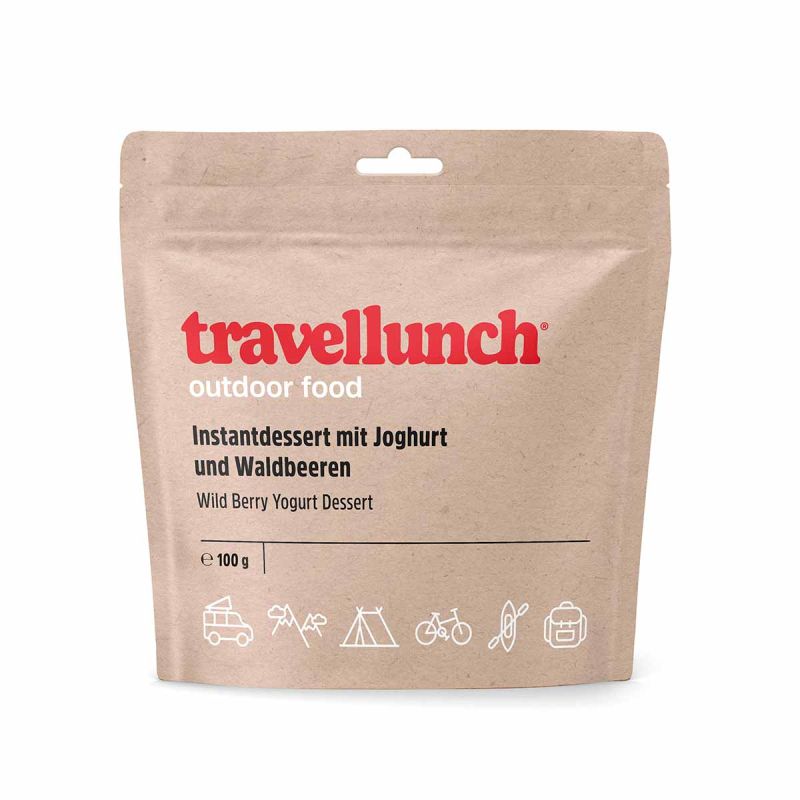 De yoghurt met bosvruchten van Travellunch is een verfrissend gevriesdroogd dessert, ideaal om een maaltijd in de buitenlucht af te sluiten met een zoete toets. Het combineert romige yoghurt met een heerlijke mix van aardbeien, frambozen en zwarte bessen voor een fruitige en smakelijke touch.