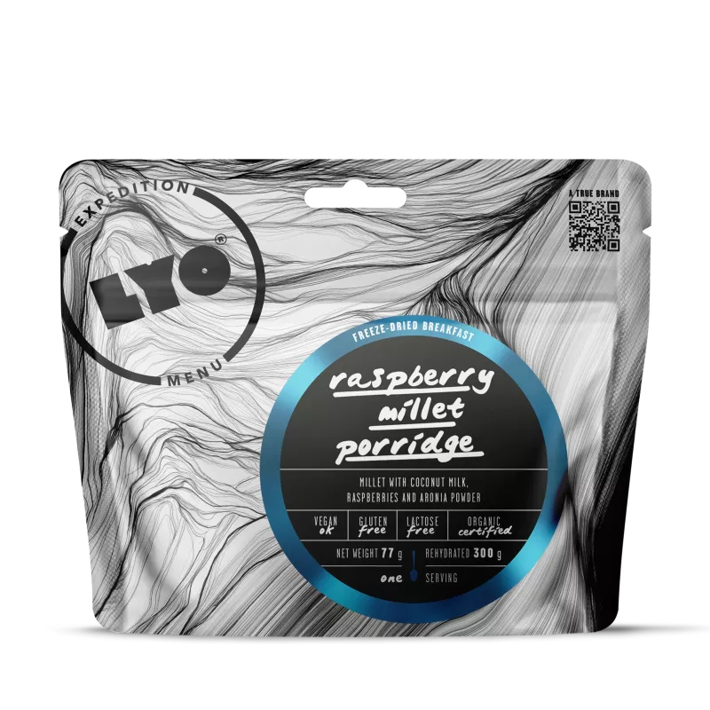 De biologische gierstporridge met framboos is een gevriesdroogd, lactosevrij ontbijt dat met warm of koud water gerehydrateerd wordt naar je wens. Met natuurlijke ingrediënten geeft dit recept je de kracht om door te gaan tijdens je avonturen. Dit ontbijt in een zakje van het merk LyoFood weegt slechts 77 g voor rehydratatie.