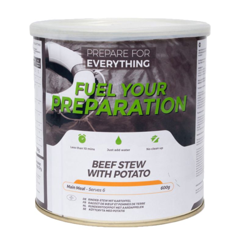 De Rundvleesstoofpot met aardappelen is een gevriesdroogde maaltijd bereid door Fuel Your Preparation, een producent van gevriesdroogde maaltijden en basisvoedingsmiddelen voor nood- en overlevingssituaties.